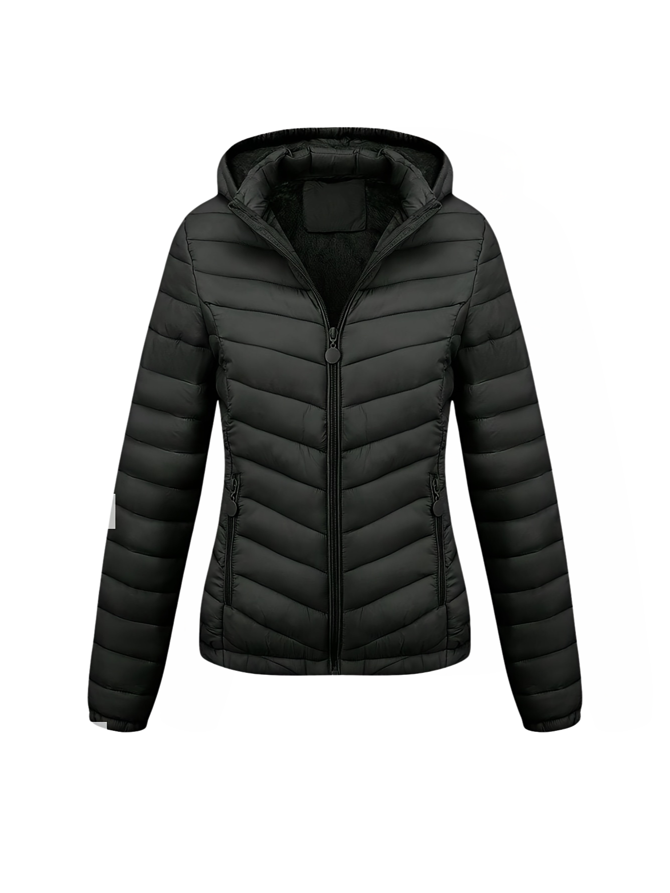 Eine gesteppte Damen Winterjacke mit Kapuze und geradem Schnitt